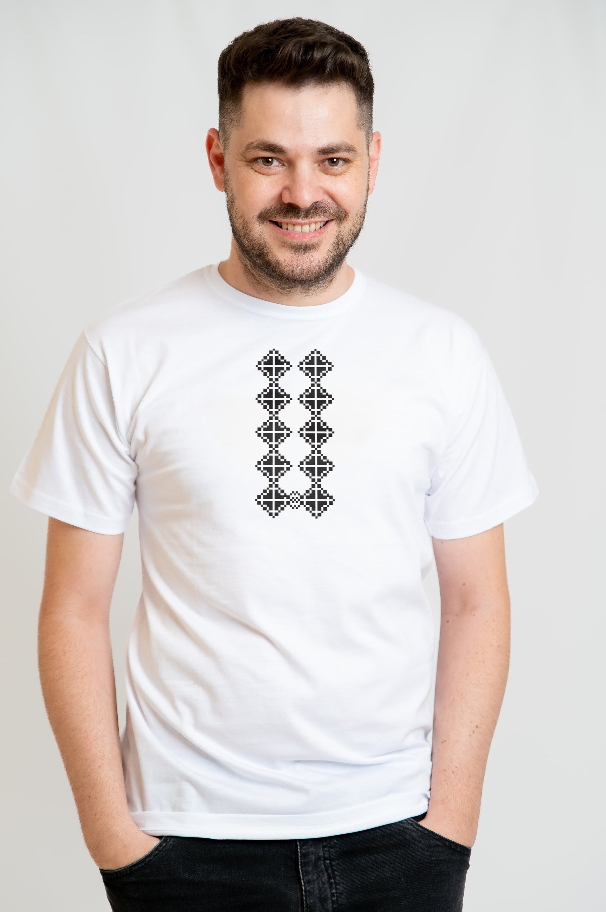 Tricou bărbați din bumbac 100%, de culoare albă, decorat cu motiv tradițional românesc din zona Muscel. Printul DTF de înaltă calitate redă cu precizie modelul geometric negru, oferind rezistență și claritate în timp.