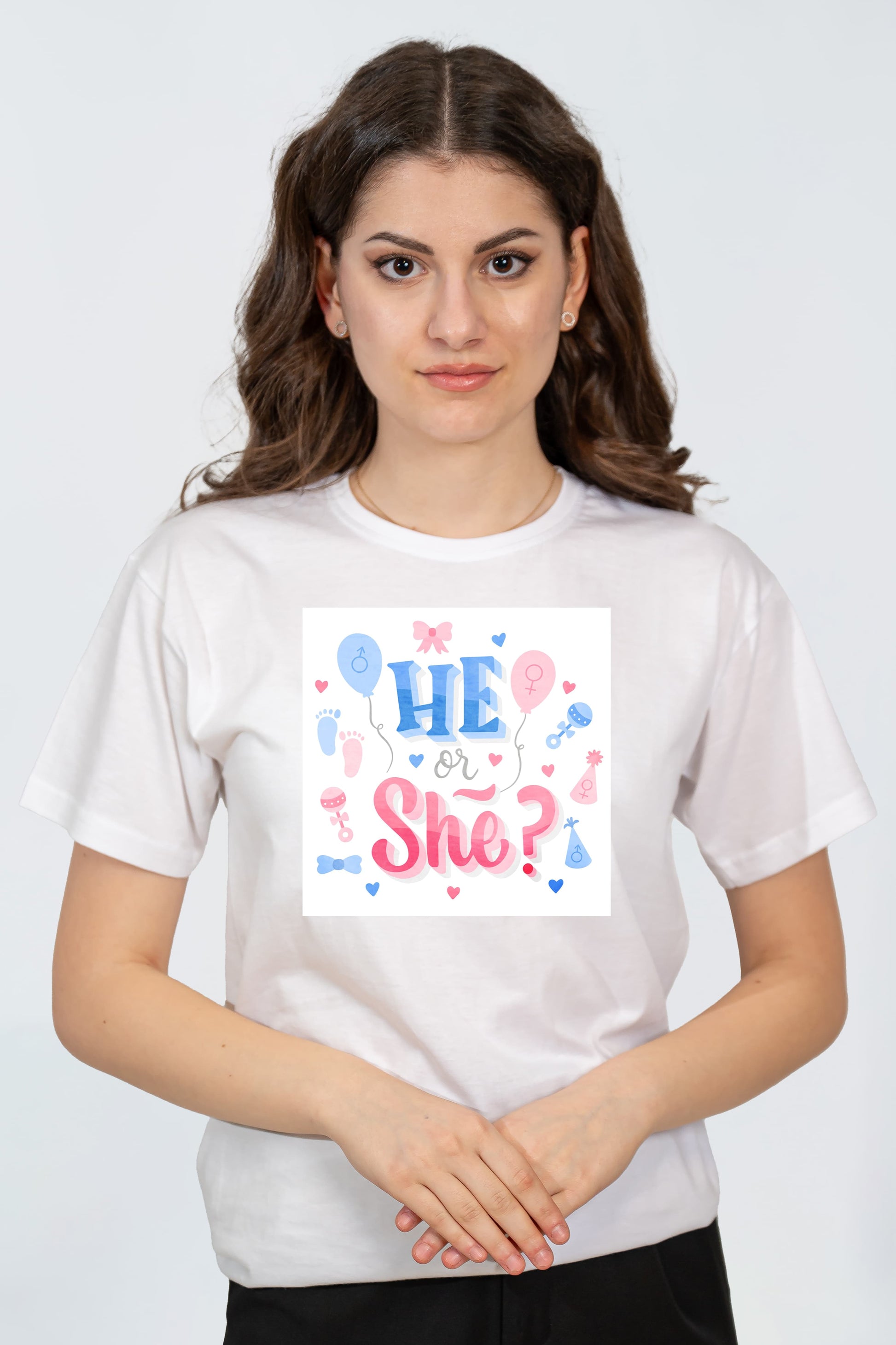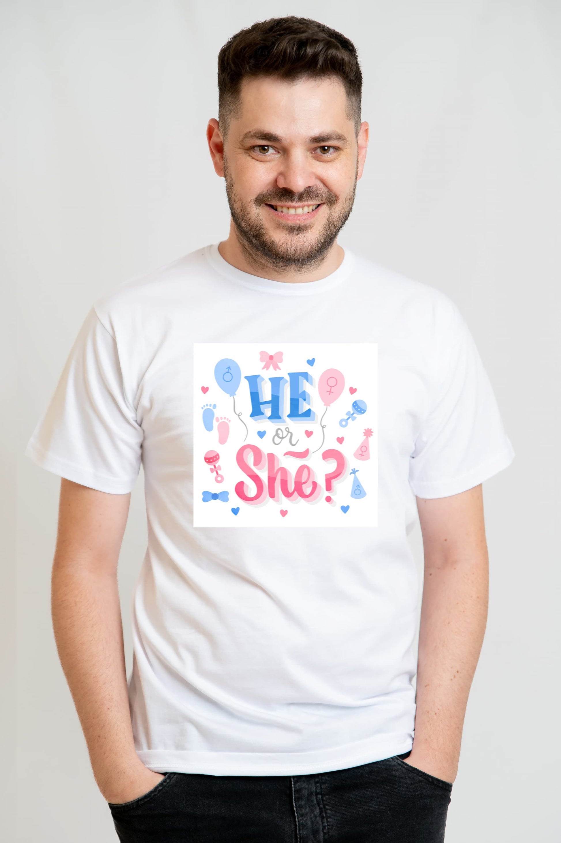 Tricou alb din bumbac 100%, realizat prin print DTF de înaltă calitate, cu design special He or She?. Ideal pentru petrecerile Gender Reveal, acest tricou aduce un plus de amuzament și emoție momentului în care viitorii părinți anunță sexul bebelușului.