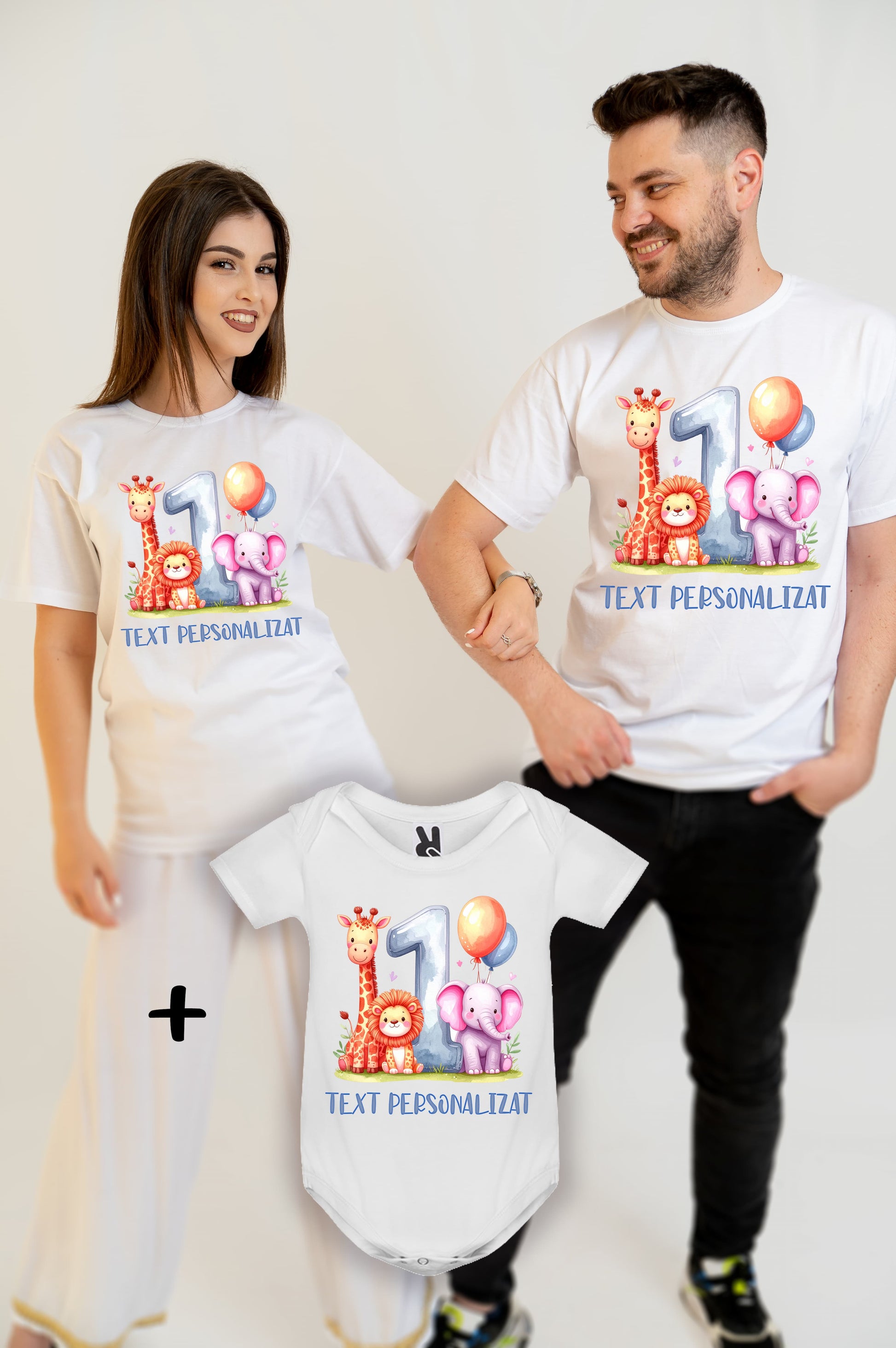 Sărbătorește primul an al copilului cu un set de tricouri familie personalizate cu design vesel, colorat, cu animale safari și baloane. Pachetul conține tricou damă, tricou bărbat și body/tricou copil, fiecare personalizat cu text sau nume la alegere.
